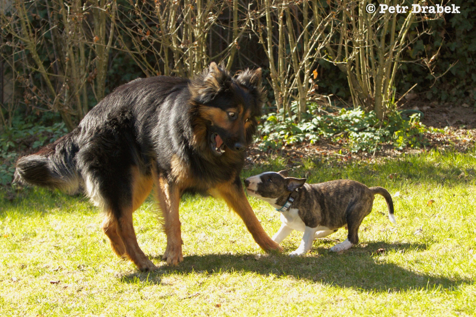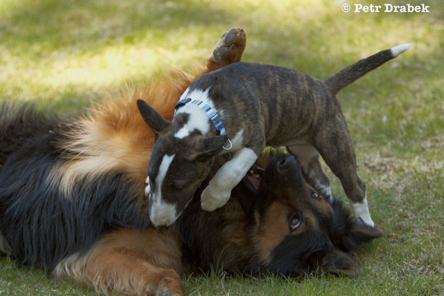 Mezi moje kamarády patří i mini bullteriér Harry. Je to zatím prcek, co rád vymýšlí lumpárny a neustále pošťuchuje, ale je s ním sranda. Zatím ho pustím i k sobě na zahradu, protože tam si můžeme pořádně zařádit a nikam neutečeme.