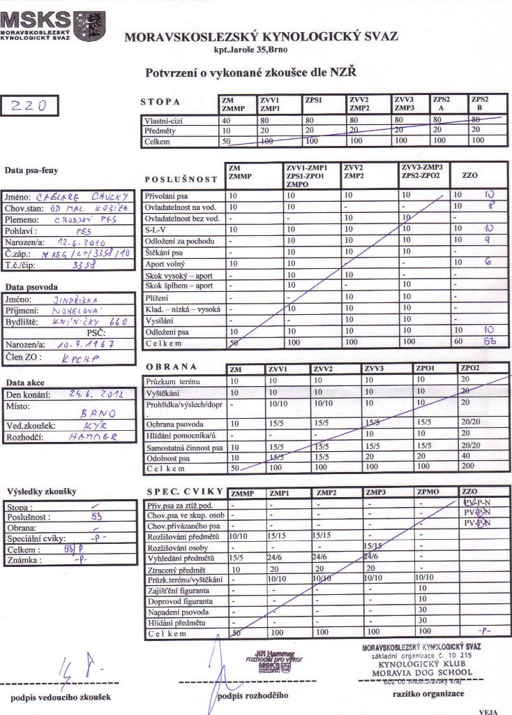 Posuzoval pan rozhodčí Hammer. Ze začátku vypadal velice přísně, ale při zkoušce byl moc fajn. Dokonce, když si panička spletla pravou s levou, hned jí říkal, ať se nestresuje, že je důležité, jak jde pes. A já jsem šel dobře. Všechny cviky jsem zvládl velice dobře, až na aport...